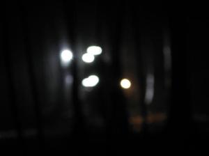 Ride through another trail and swoop back for another. I pull off down the fireroad to take some pictures through the trees as they approach. I wait for ages alone in the pitch dark. I cannot see the anything other than the faint l.e.d. of the camera. Slowly strange lights wink through the timber.