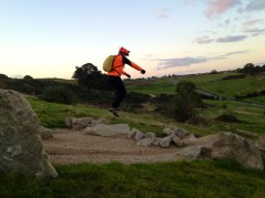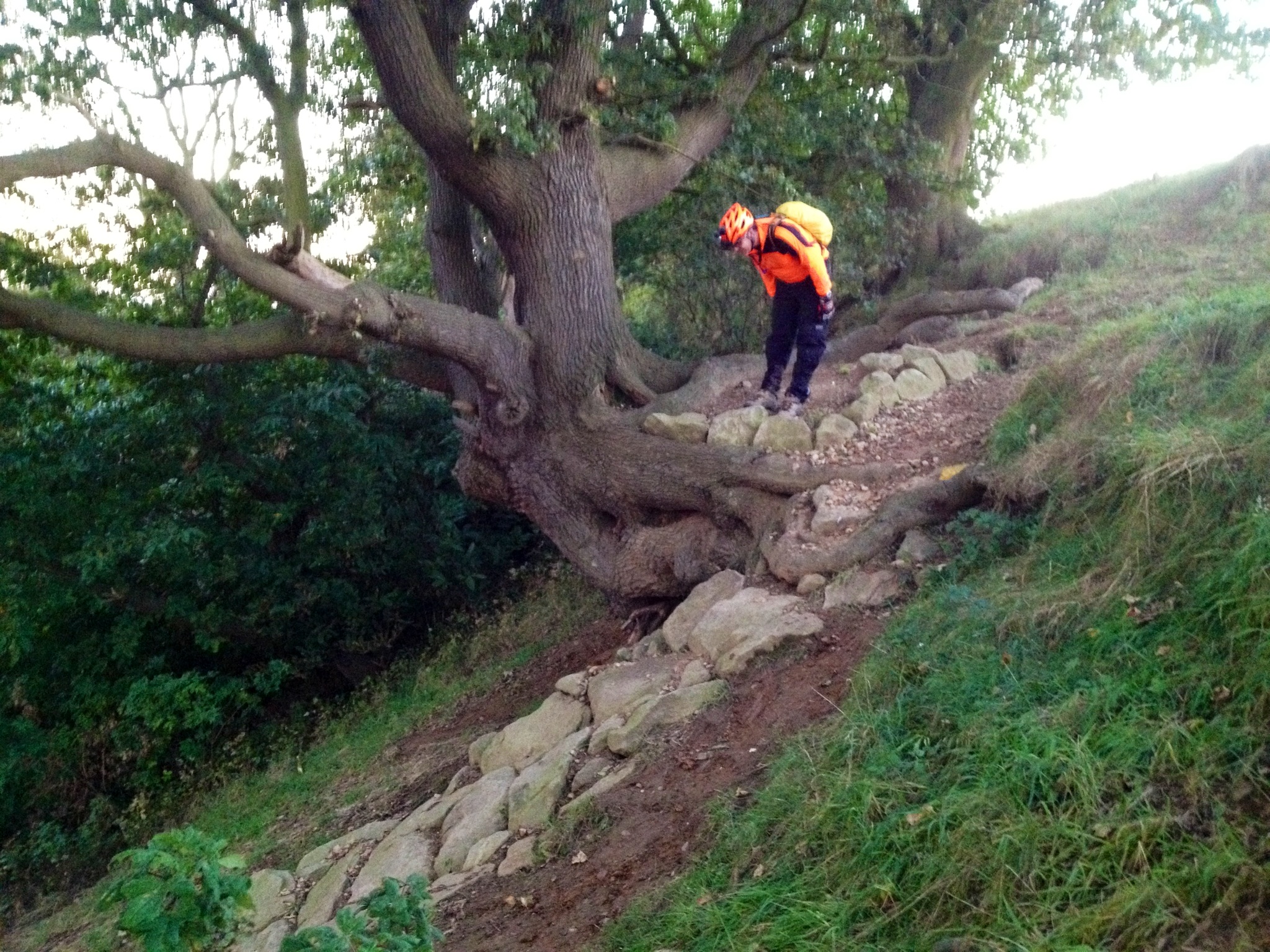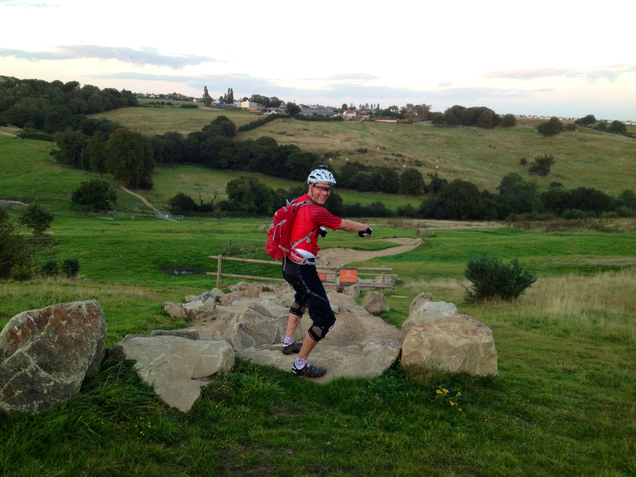 singletrack that was a compilation of their regular rides. After about an hour we found ourselves on a section of the Olympic course that extended beyond the boundary of Hadleigh Farm. Specifically it was the part from Deane’s drop, through the slightly wooded section that then loops back up to the top of the rock garden. The rock garden itself was within the farm boundary but we could see it from the fence. In the half light we climbed over the gate and found ourselves at the top. The rocks looked a lot smaller on tv! There was a range of rideable lines, but the potential for disaster was everywhere.