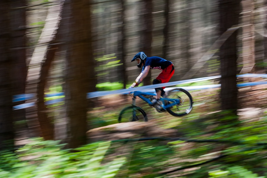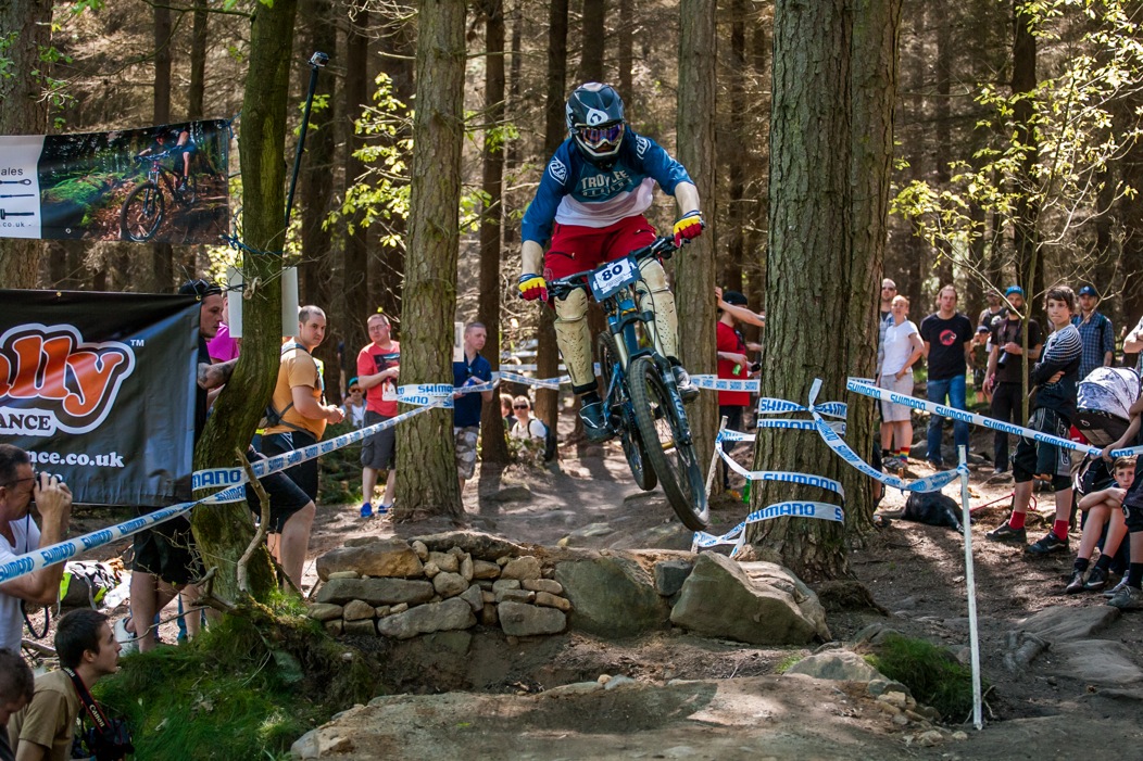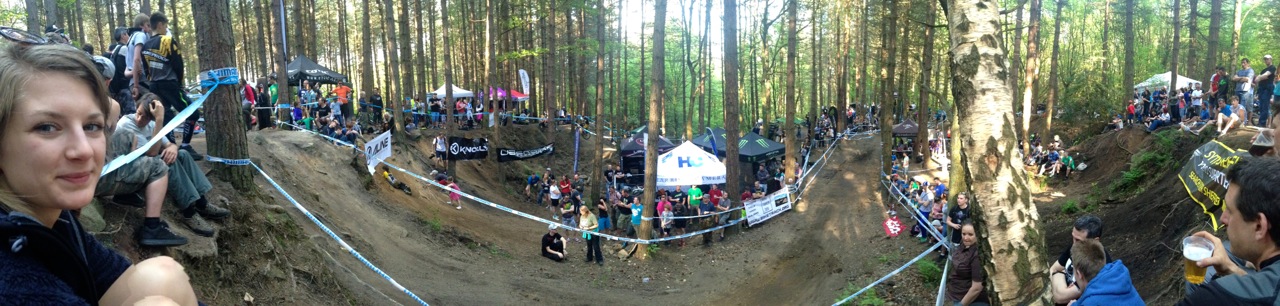 The top section through the most dense part of forest consisted of a scaffold constructed roll in, then some flat out pedalling. Into a few switchbacks littered with rocks, then a rocky approach to a double, with the notorious cheering crowd, in a constant frenzy and howling for every single rider as if each were Steve Peat himself. After the double comes a rocky open section requiring a careful line selection. A few more tables follow, with precariously positioned photographers angling expensive lenses from frighteningly close proximity, then a tight, flowy switchback section; off the brakes and pumping all the way, then out into the finishing arena. From here is a step down (and an alternative line for less confident riders) which sees the fastest riders drop about 15 feet and crank it to the line.