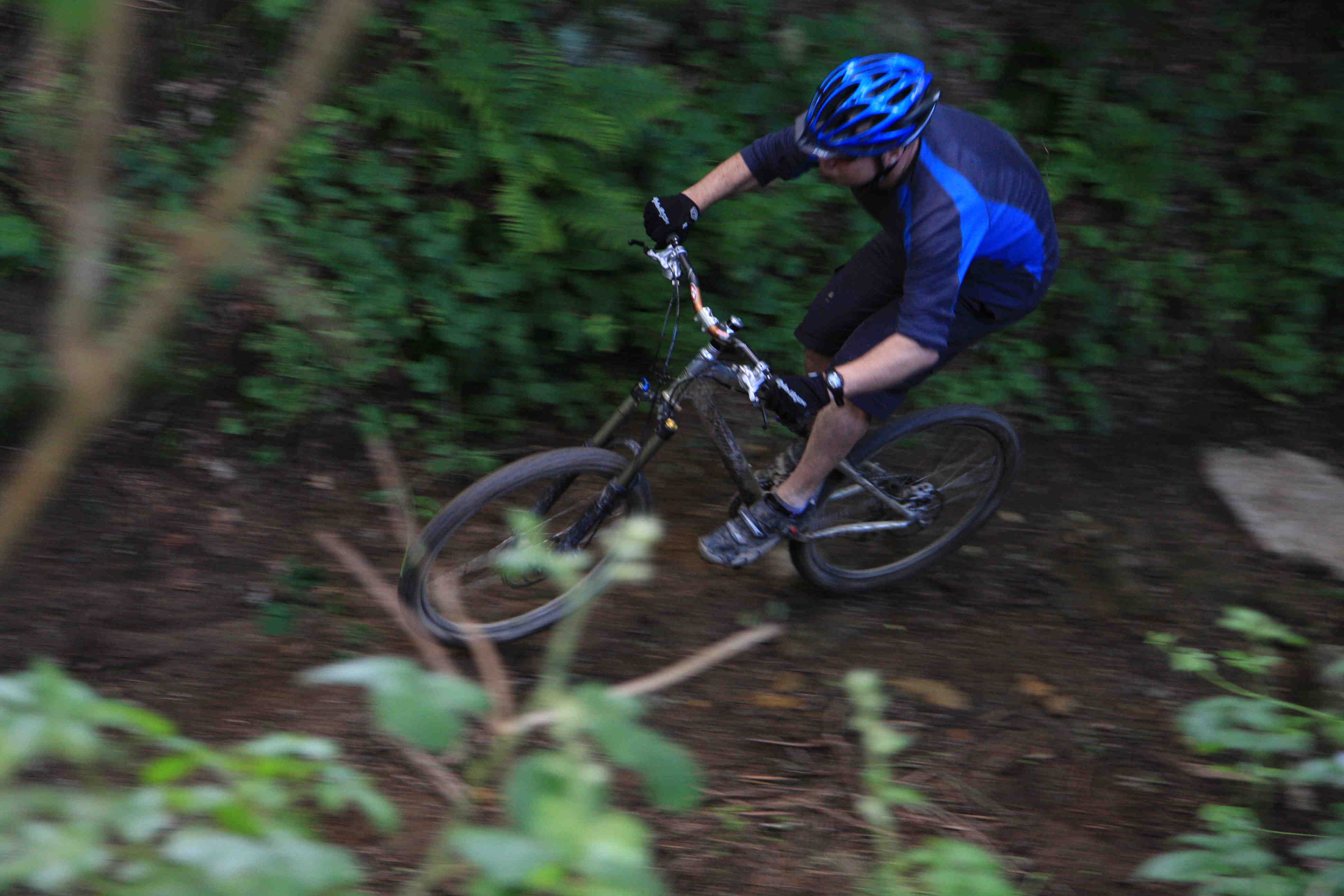 First time out at Whiteways, slippy, treacherous, rooty single track, straight over the top. A drop off with a steep edge, straight down, and even the large bomb hole drop, straight down. Now I have led a few rides round here and usually a few people shy away from this drop or at least need some reassurance to roll over the edge. So all my advantage gained from years of experience evaporated in just one ride.